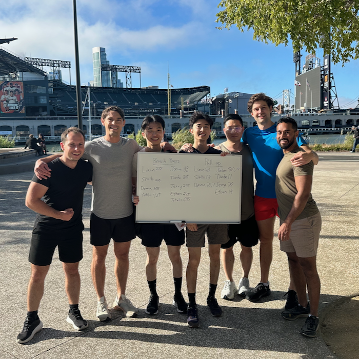 AI race. With Liam and a few other friends, I did an “AI race”, which was a short relay race in addition to a one rep max bench press and a pull up competition. There is something so fun about a bunch of guys competing in various exercises, especially AI researchers!